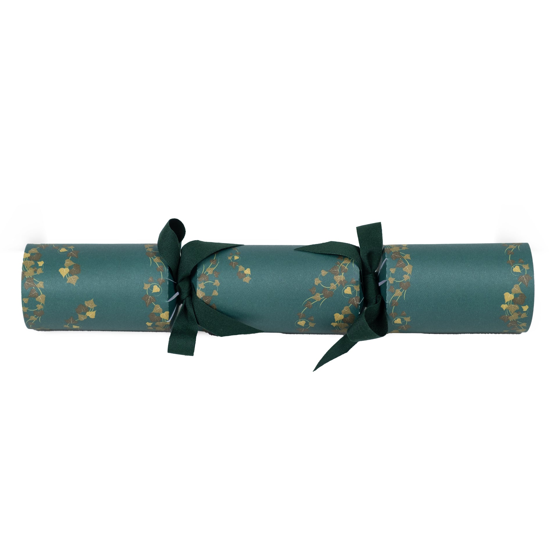 Six luxury Christmas crackers with a dark green and gold ivy design, matched with green Tencel ribbon.